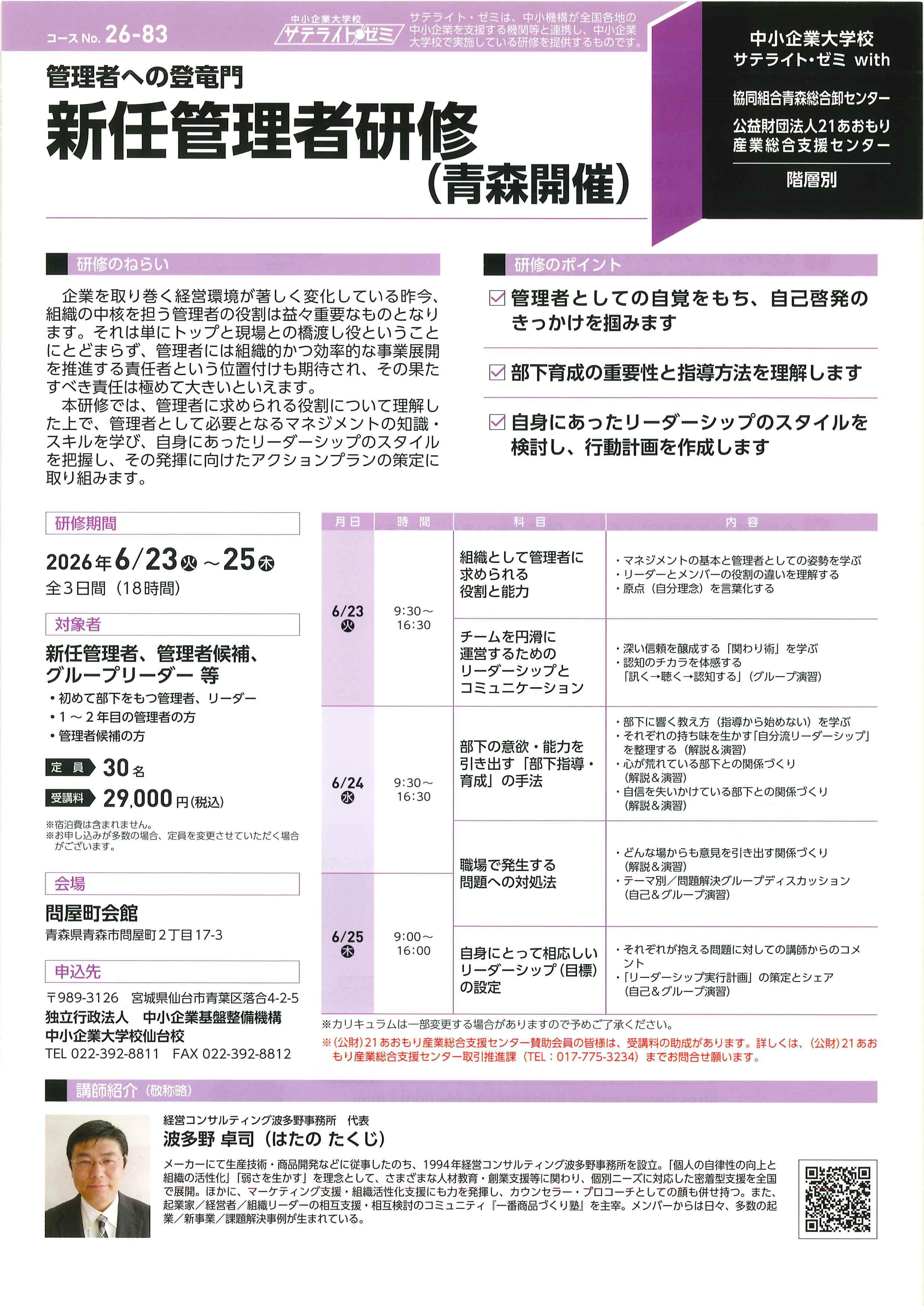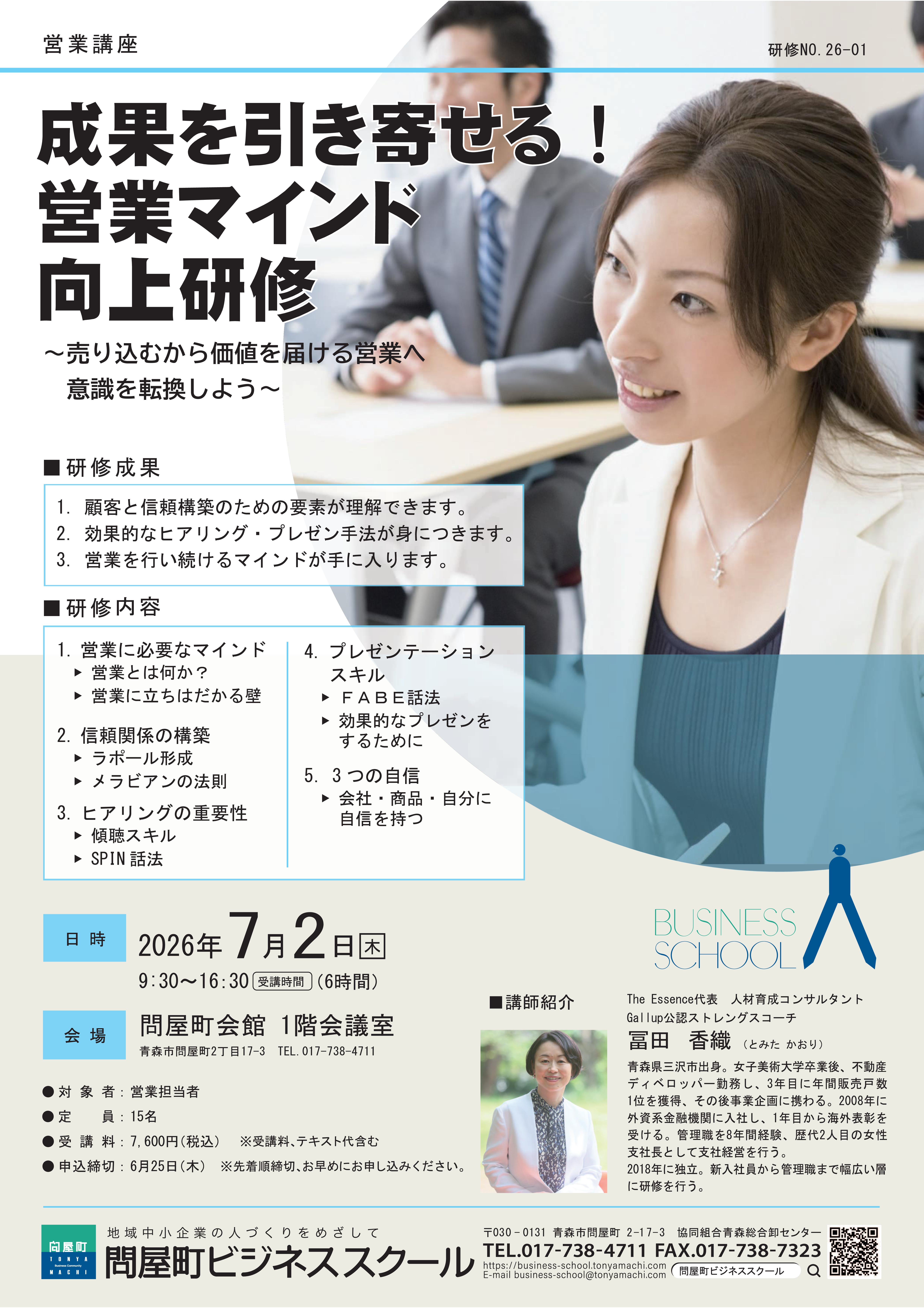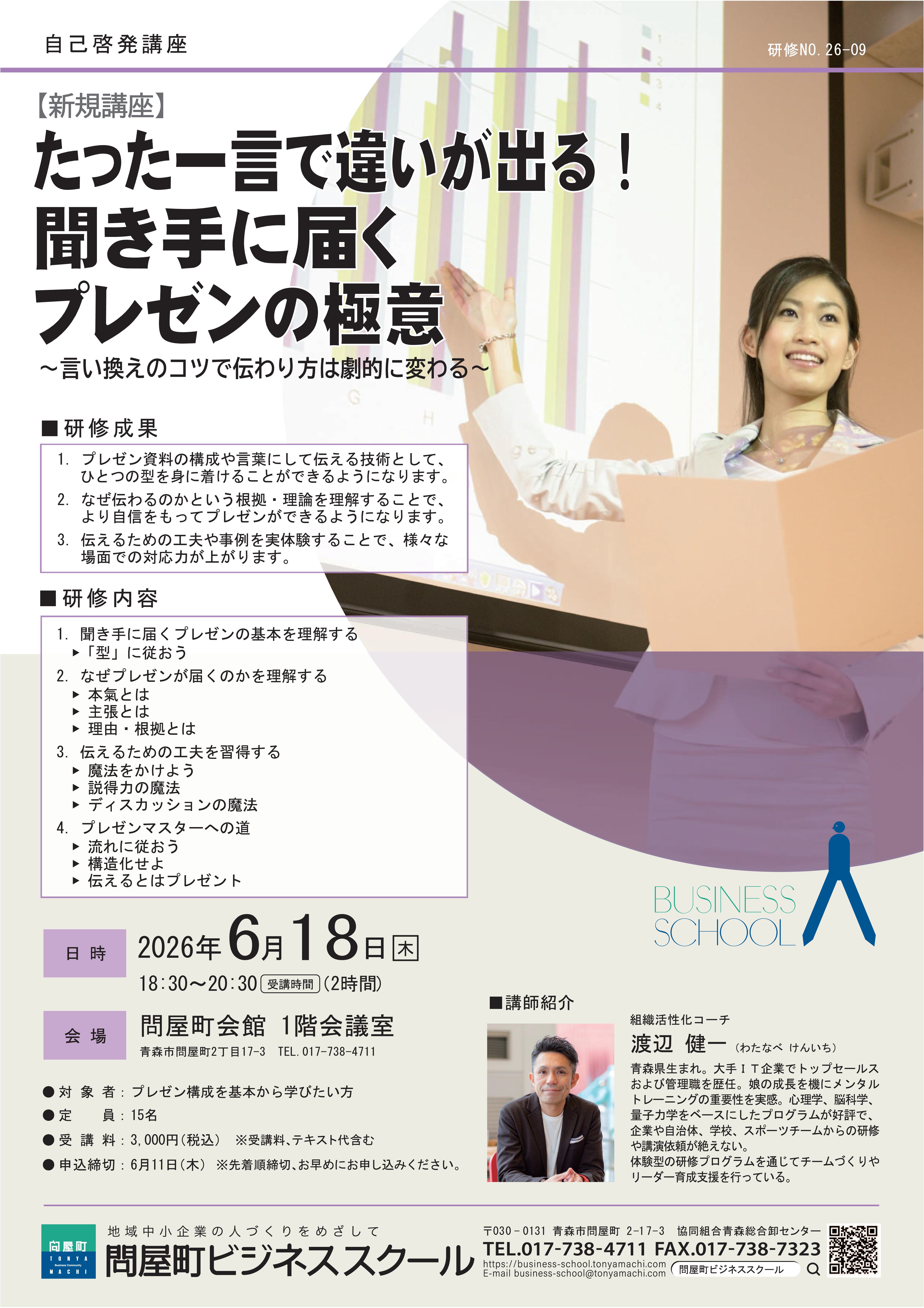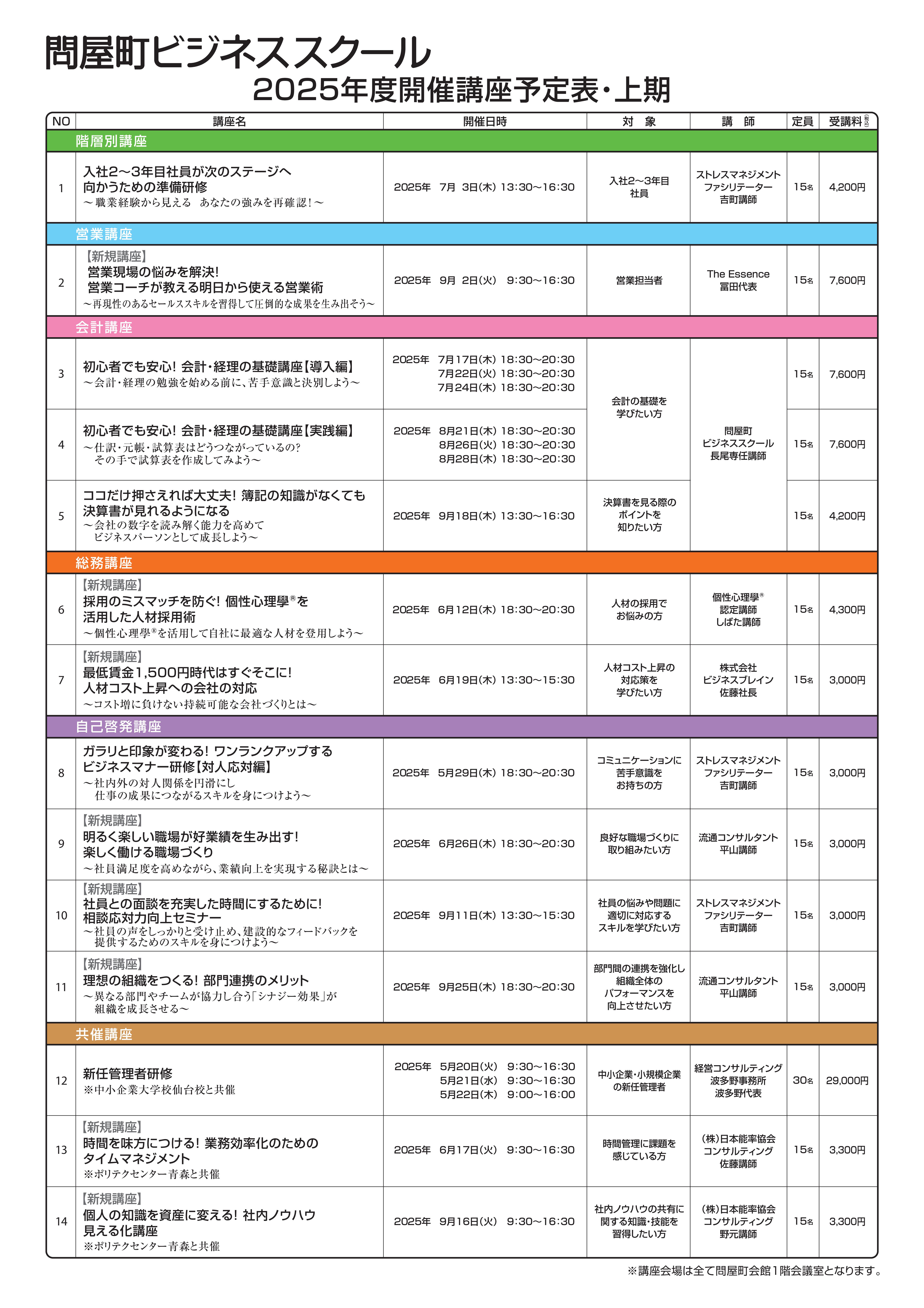 また、当スクールは、受講者を組合員企業だけに限定せず、青森市内外の員外企業にも広く開放し、多くの企業に常設の人材教育施設として利用いただくことで、青森市・青森県の経済の発展に僅かながらでも寄与できるよう取り組んでまいります。