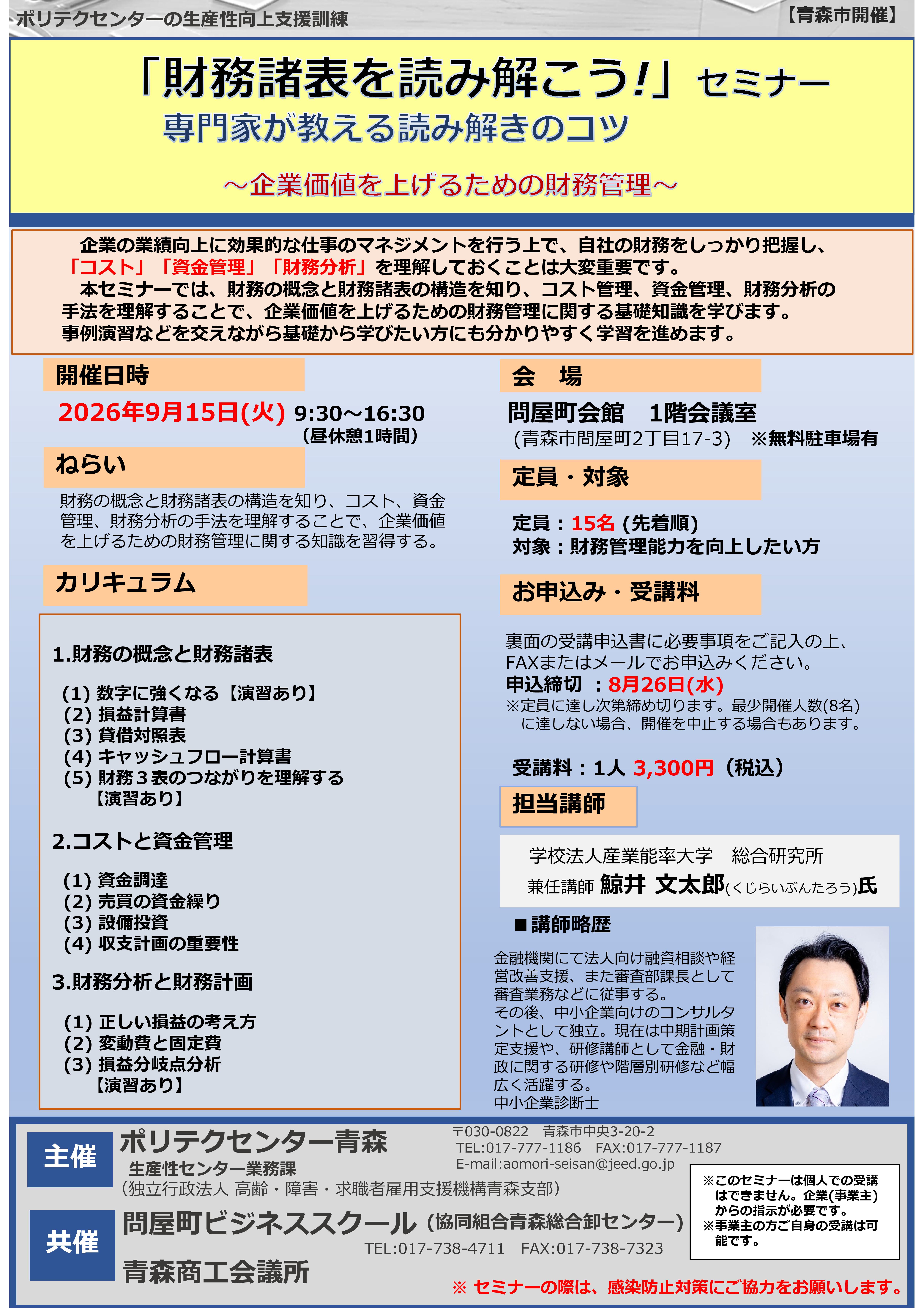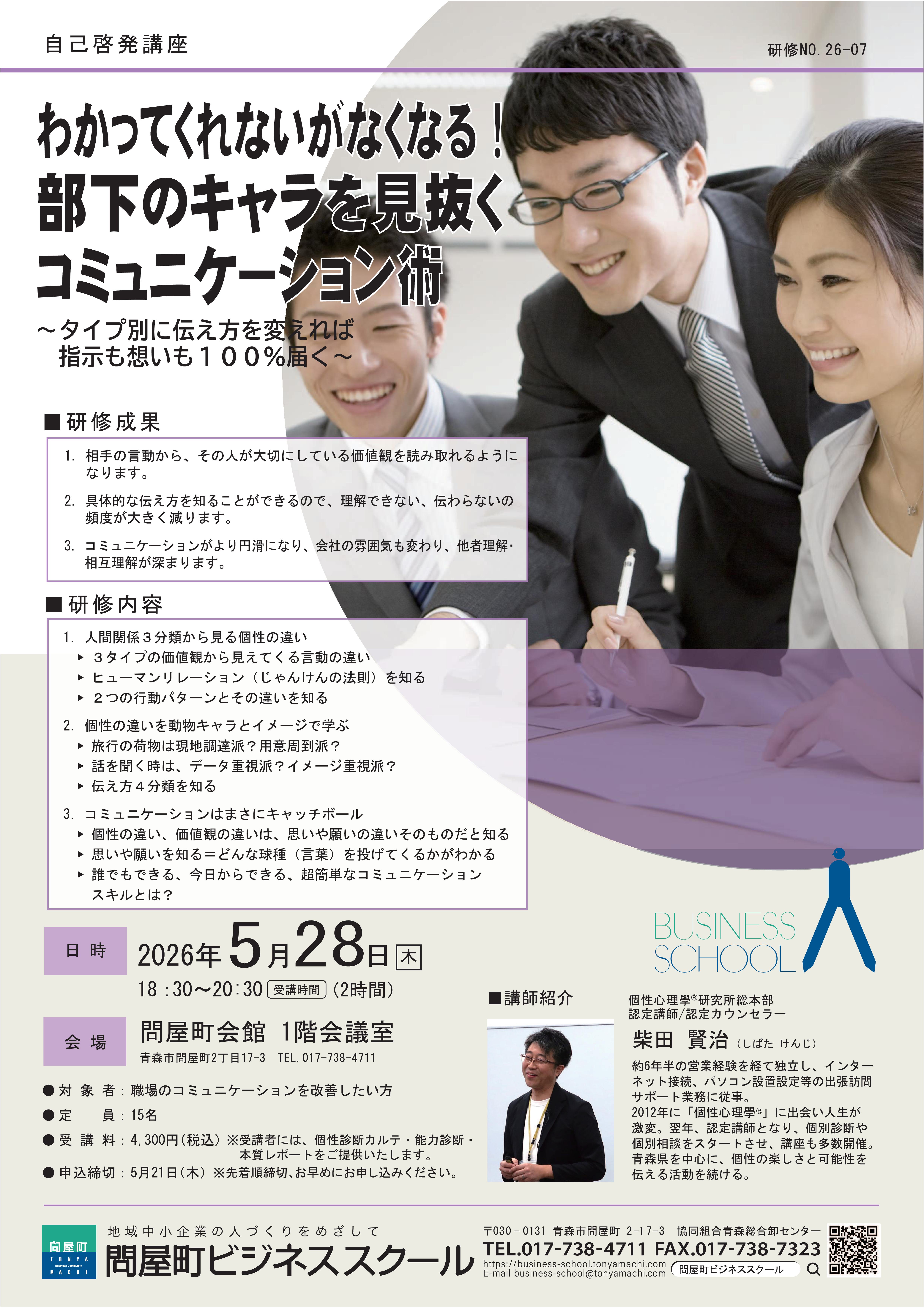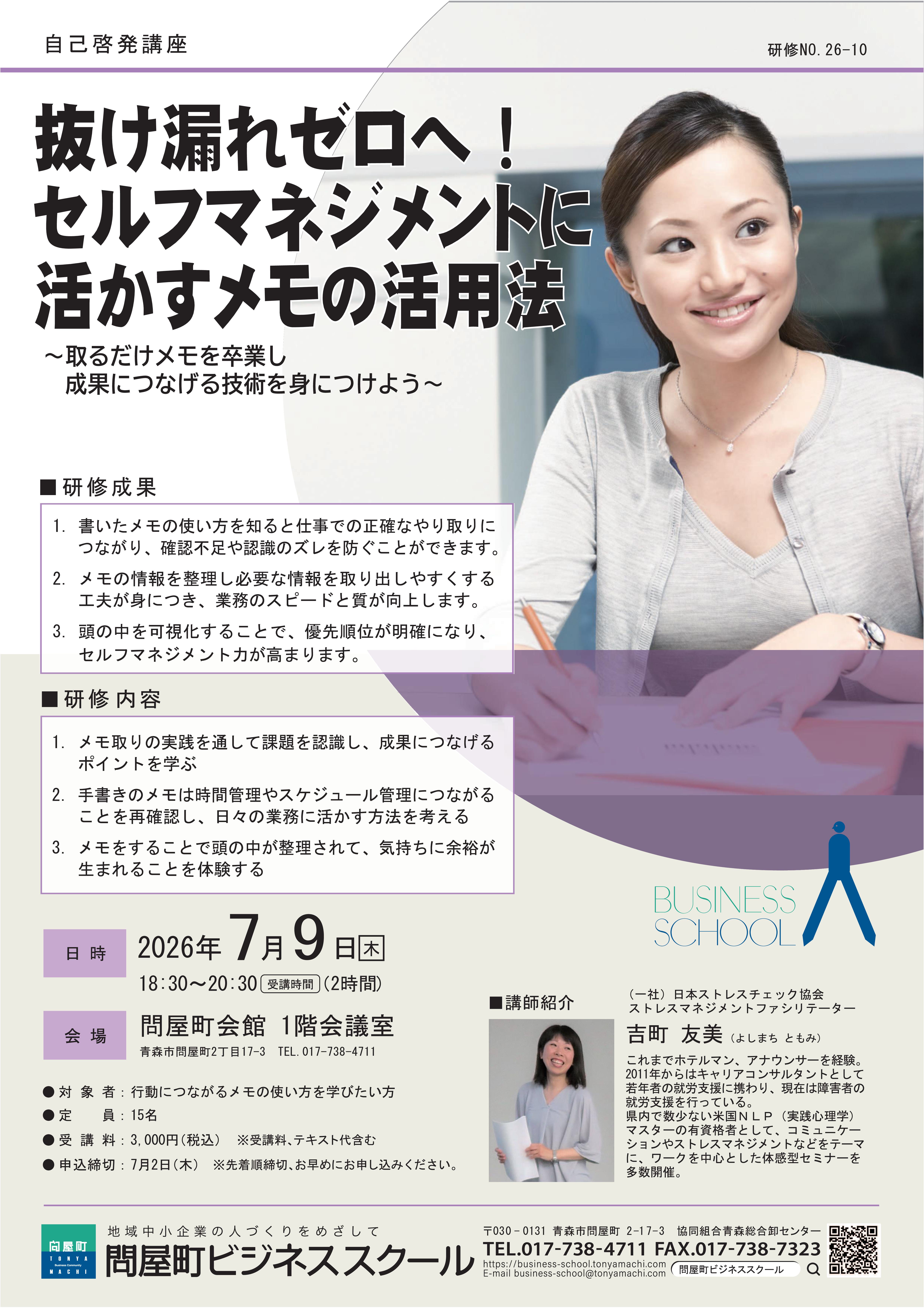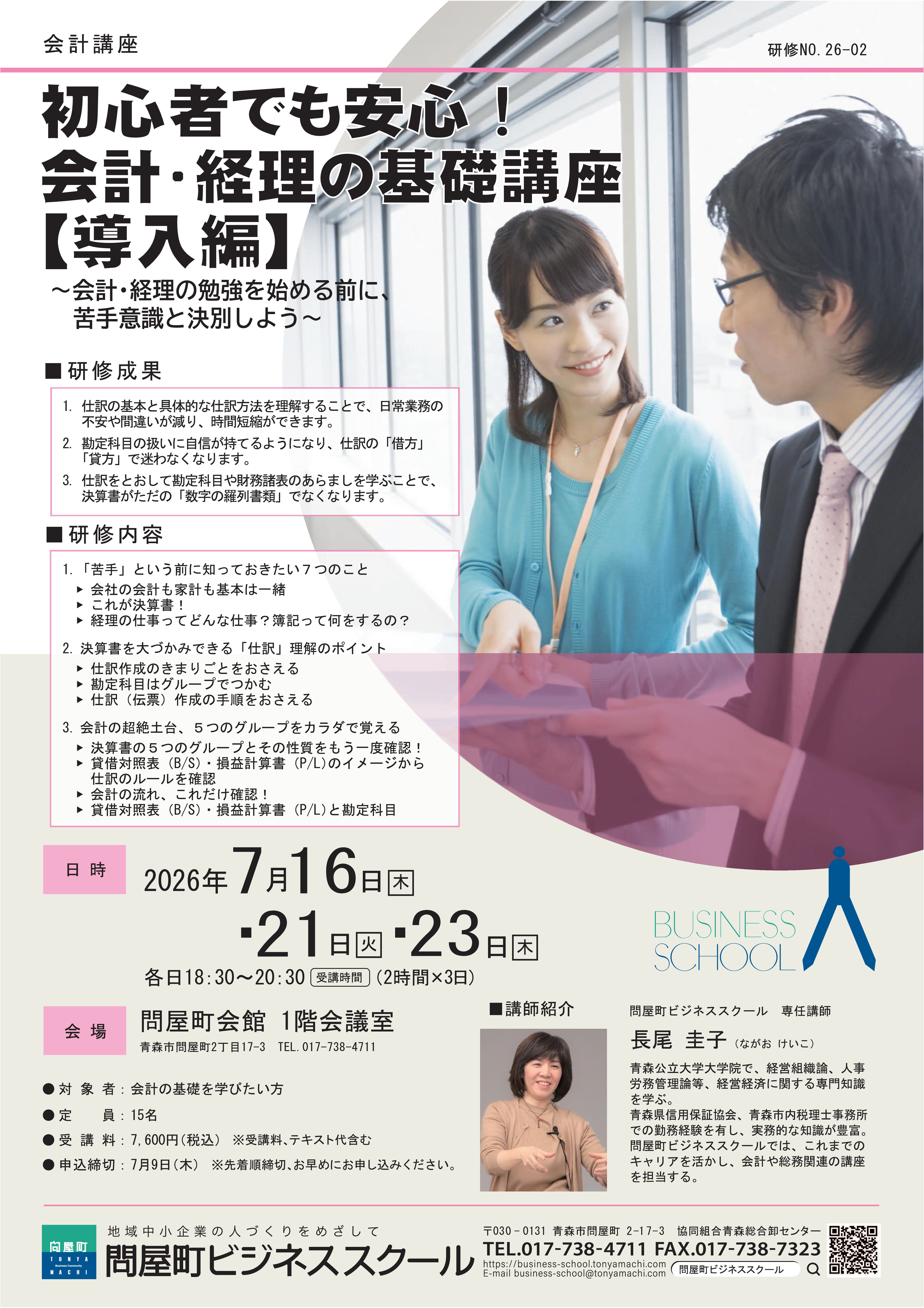 また、当スクールは、受講者を組合員企業だけに限定せず、青森市内外の員外企業にも広く開放し、多くの企業に常設の人材教育施設として利用いただくことで、青森市・青森県の経済の発展に僅かながらでも寄与できるよう取り組んでまいります。